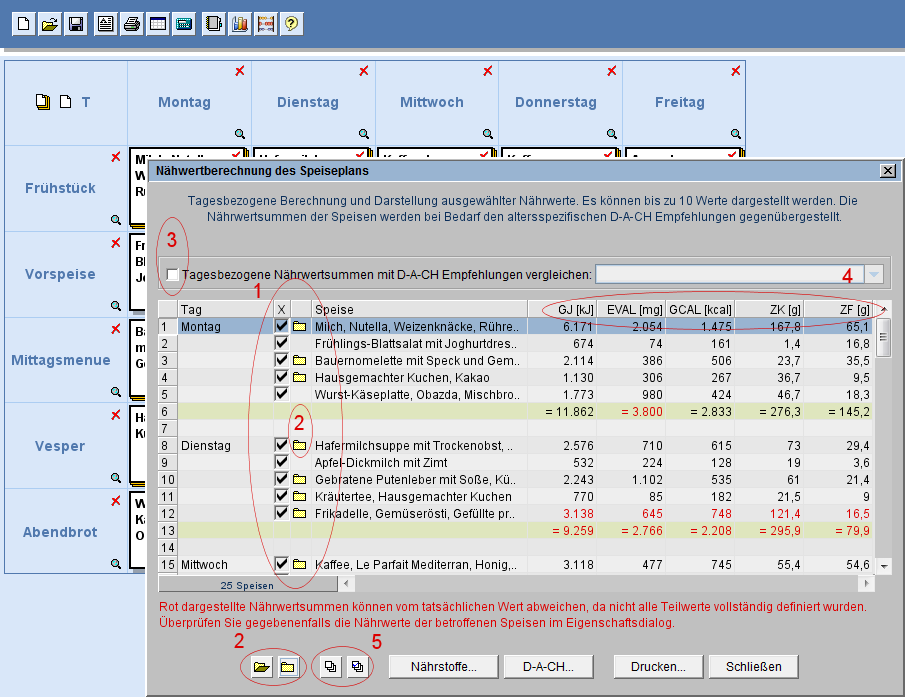 Sie kehren über die Schaltfläche [Berechnung...] (s. Markierung 4) zur Nährwertberechnung des Speiseplans zurück.