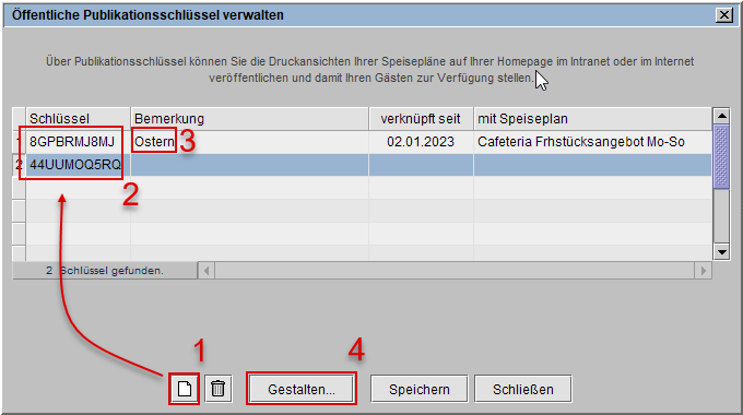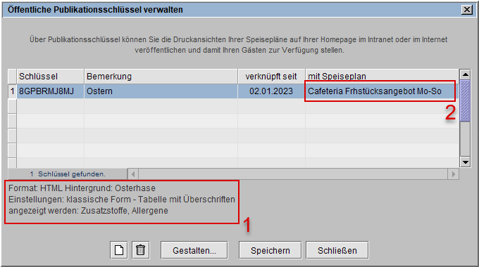 Haben Sie bereits Publikationsschlüssel zu Ihren Speiseplänen zugeordnet, finden Sie zu jedem Schlüssel in der letzten Tabellenspalte die Information, welcher Schlüssel zu welchem Speiseplan gehört (s. Markierung 2).