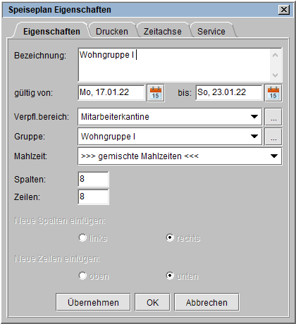den Dialog Speiseplan Eigenschaften, in dem die Basisparameter für Ihren Plan definiert werden. Speiseplan Eigenschaften