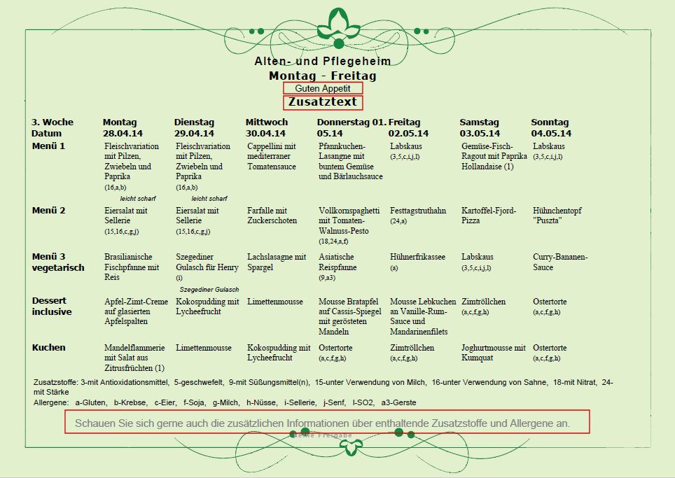 Speiseplan diese zusätzlichen Druckinformationen