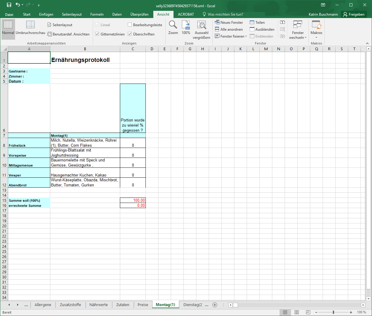 Das Ernährungsprotokoll läßt sich wie jedes andere Excel-Datenblatt bearbeiten und formatieren. Sie können es daher vor dem Druck bzw. personenbezogenen Speichern individuell gestalten