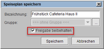 Für die Freigabe muss der Speiseplan vorher gespeichert sein, sonst gibt es folgenden Hinweis: "Speichern Sie bitte erst den Speiseplan, um diese Funktion nutzen