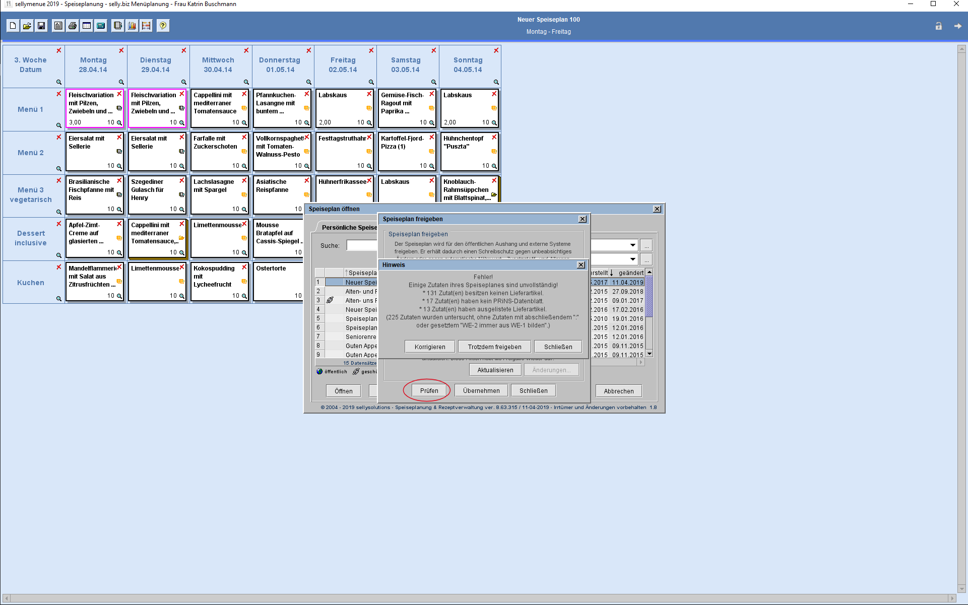 Beim Öffnen eines veralteten Speiseplanes erhalten Sie einen Hinweis (s. r.).