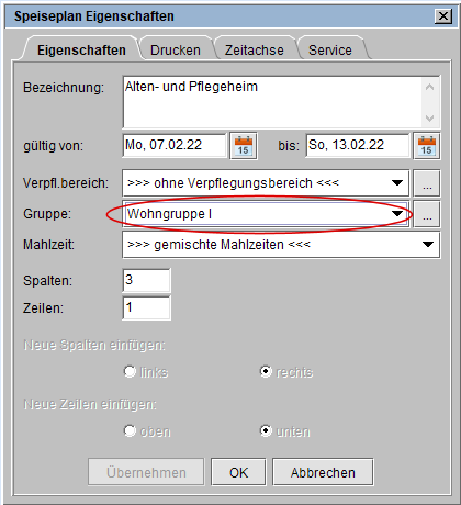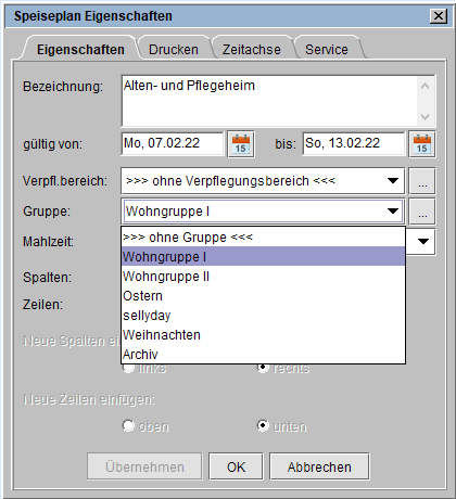 In den Speiseplan Eigenschaften wählen Sie die Gruppe aus der Liste, in der der Speiseplan abgelegt werden soll (s. Bild links).