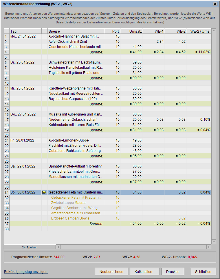 Die tabellarische Übersicht der Wareneinstandswerte zeigt Ihnen pro Speise oder Menü, pro Tag und für den gesamten Speiseplan den nach Ihren Vorgaben berechneten zu erwartenden Umsatz im Vergleich zu den Wareneinständen WE-1* und WE-2** sowie das Verhältnis Ihres Wareneinstandes WE-2 zum zu erwartenden Umsatz.