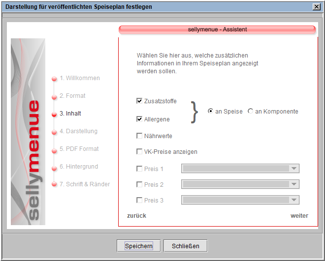 Für die zusätzlichen Informationen über vorhandene Zusatzstoffe und/oder Allergene wählen Sie zwischen den Darstellungsoptionen der Zusatzstoff- und Allergenkennzeichnung an der Speise oder an der Komponente (s. dazu Speiseplan drucken).