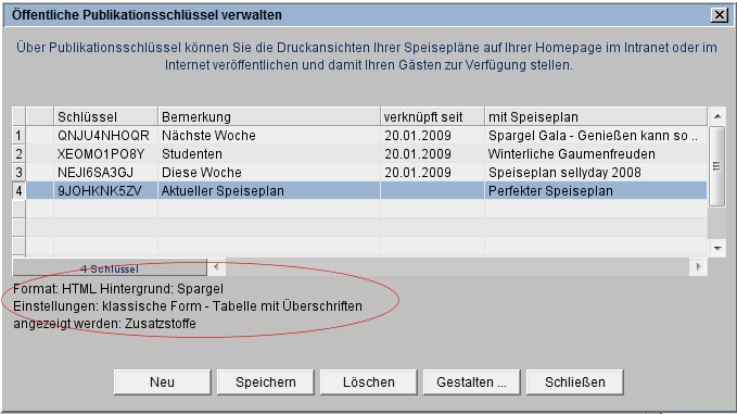 Haben Sie für einen Publikationsschlüssel Darstellungsparameter definiert, werden diese jetzt unterhalb der Tabelle ausgegeben (s. Markierung 1).