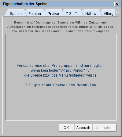 Im Reiter Preise brauchen Sie keine Eintragungen vorzunehmen, falls Sie im Reiter Speise bereits das Kästchen