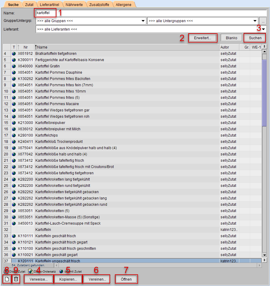 Zum Auffinden einer Zutat geben Sie einen Suchbegriff in das Feld Name (s. Markierung 1) ein.