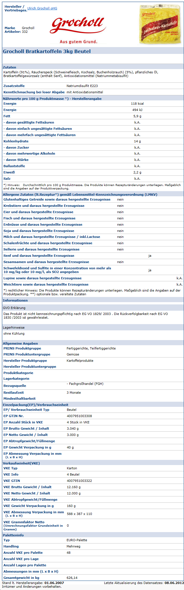 Das Produktdatenblatt liefert alle relevanten Artikelinformationen und ist neben dem BLS eine sehr gute Quelle für die Nährwertberechnung.