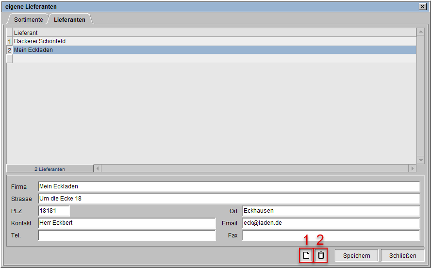 In diesem Dialog erfassen und verwalten Sie Ihre eigenen Lieferanten. Hier schaffen Sie die Voraussetzungen für die Auswahl der Sortimente und letztendlich des Artikels