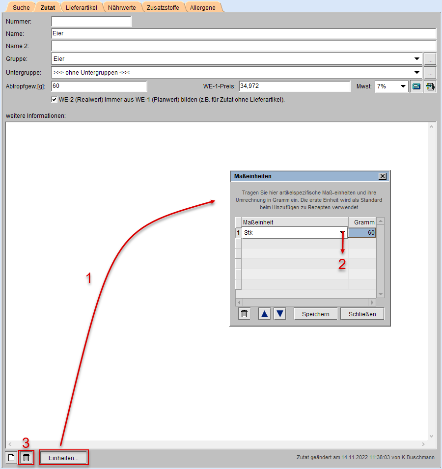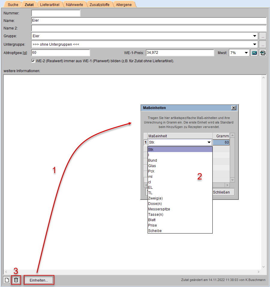 Um artikelspezifische Maßeinheiten und die dazugehörige Umrechnung in Gramm auszuwählen bzw. einzutragen, wählen Sie die Schaltfläche [Einheiten...] (s. Markierung 1). Sie
