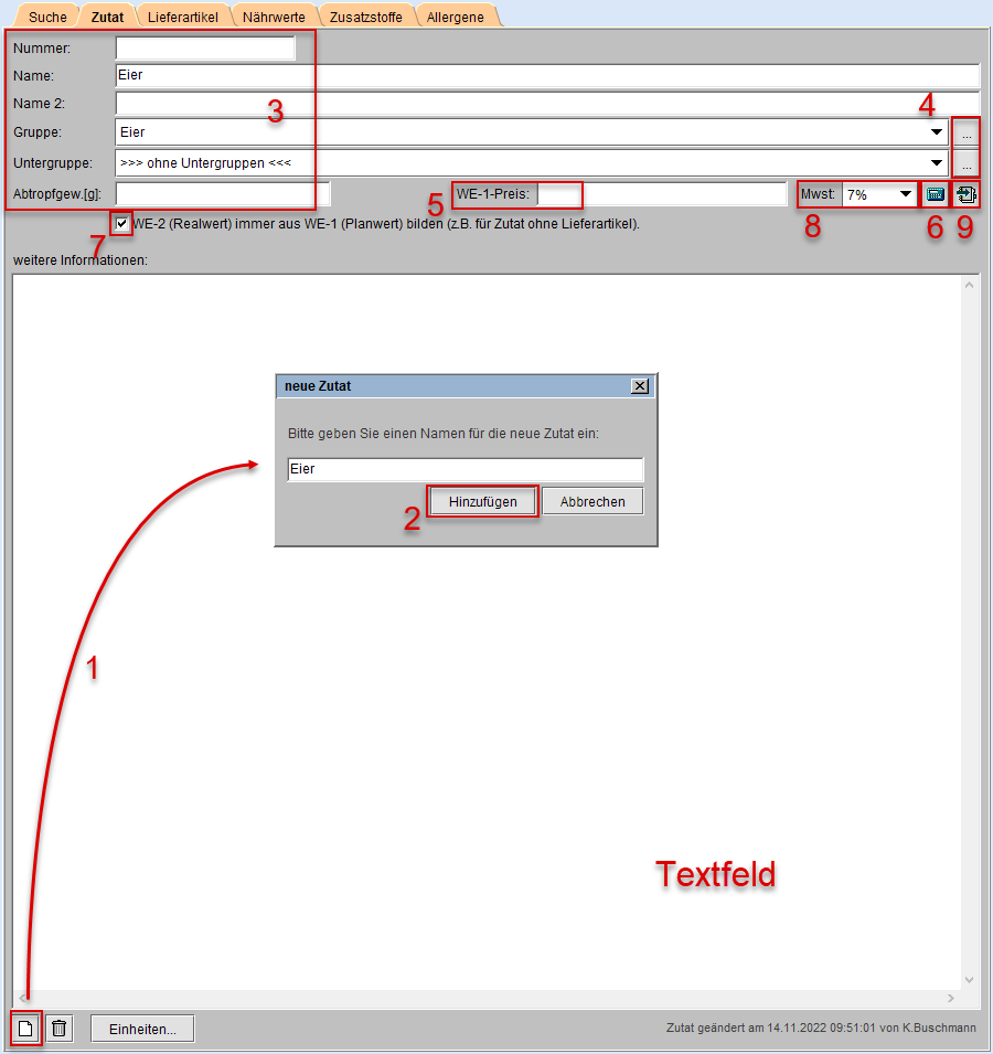 (s. Markierung 1), vergeben den Namen der Zutat und klicken auf [Hinzufügen] (s. Markierung 2).