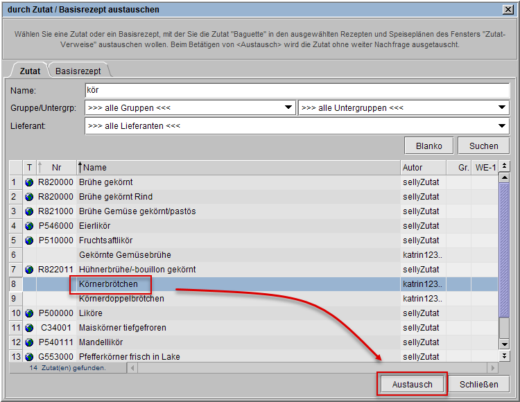 Im Dialog durch Zutat / Basisrezept austauschen markieren Sie die Zutat in der Tabelle (im Beispiel Körnerbrötchen) und klicken auch hier auf [Austausch] (s. l. Markierung).