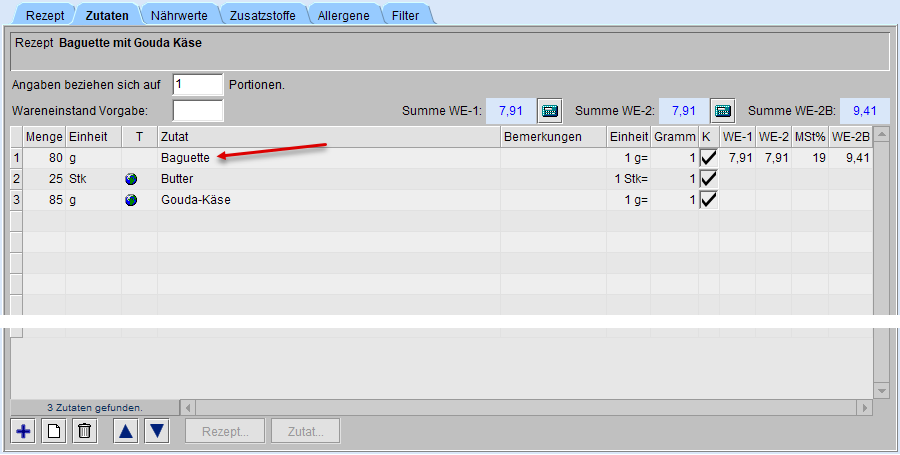 Es öffnet sich der Rezept-Editor (s. r.) und im Reiter Zutaten ist die verwendte Zutat, im Beispiel Baguette, zu finden.