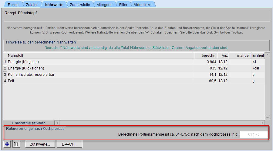 Im Reiter Nährwerte des Rezepteditors besteht die Möglichkeit, sich entweder nur die berechnete Gesamtzutatenmenge pro Portion anzeigen zu lassen oder diese durch Einbeziehung von Kochverlusten etc. zu korrigieren. Wurde keine Menge manuell eingetragen, erscheint in grauer Textfarbe die berechnete Portionsmenge.