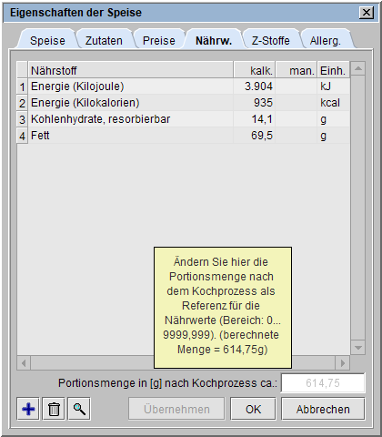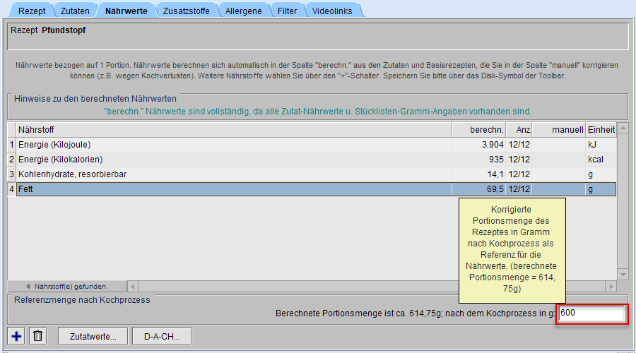 den Dialog Rezept und wechseln in den Reiter Nährwerte.