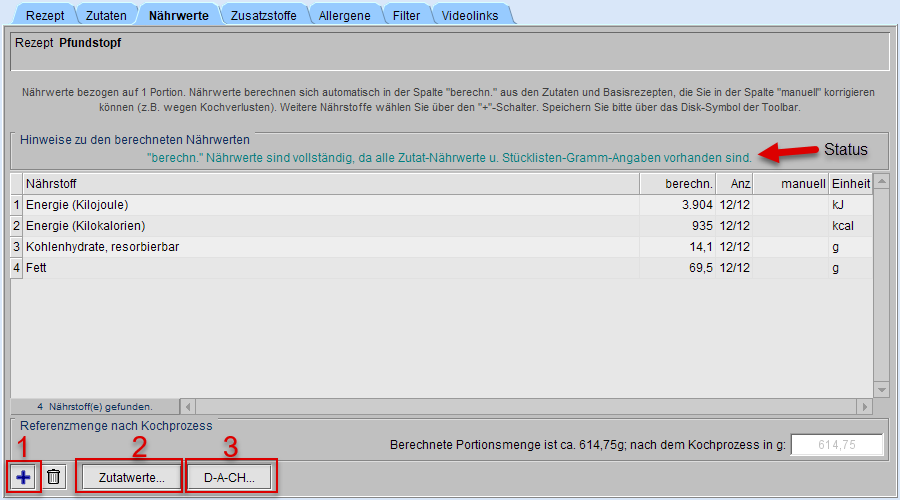 Ein Vergleich der Rezept-Nährwerte mit empfohlenen Tagesdosen erhalten Sie über [D-A-CH...] (s. Markierung 3).