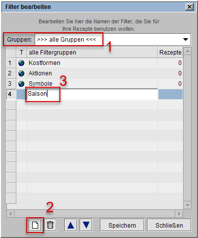 (s. Markierung 2) und geben in die leere Zeile die Filtergruppenbezeichnung ein (s. Markierung 3).
