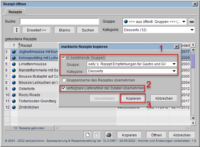 Mit Klick auf [Kopieren] (s. o. Markierungen 3) erhalten Sie die Kopie der markierten Rezepte.