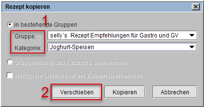 Wählen Sie die Option in bestehende Gruppen für den Kopiervorgang, wird das Rezept bzw. die Rezepte in die hier ausgewählte Gruppe und Kategorie (s. Markierung 1) übernommen.