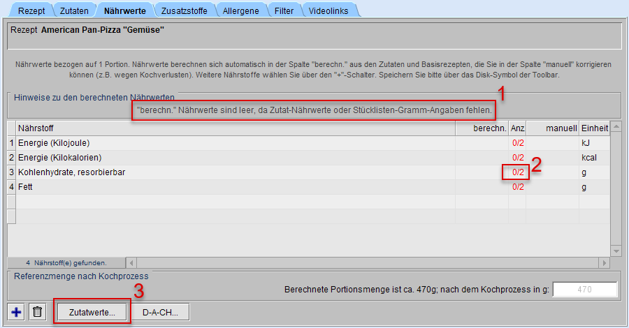 Informationen über die Einzelnährwerte pro Zutat bekommen Sie mit Klick auf die Schaltfläche [Zutatwerte...] s. Markierung 3).