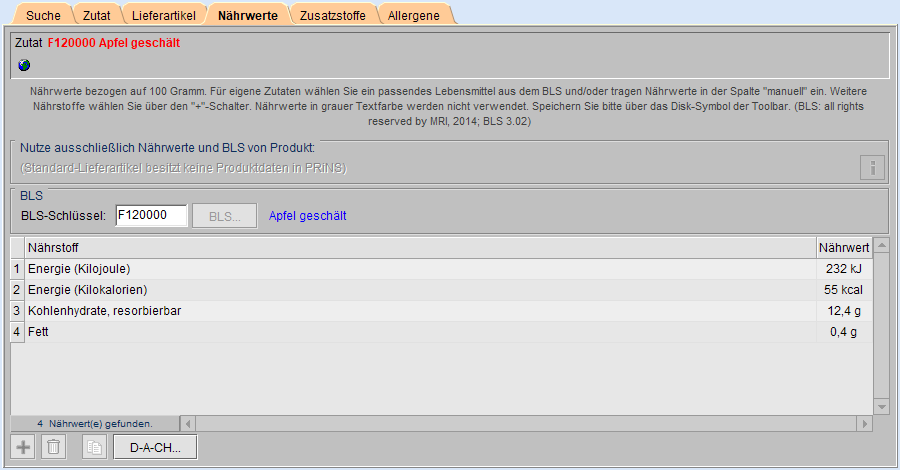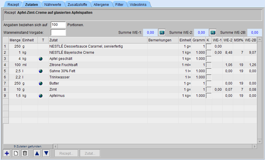 Mit Klick auf die Schaltfläche [Zutat...], werden die Einzelnährwerte der Zutaten anzeigt.