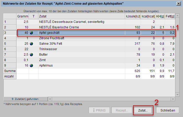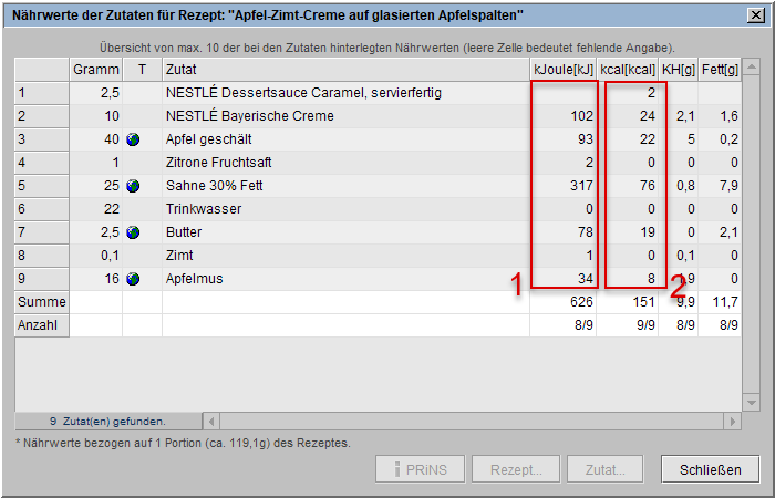 in der für jede Zutat ein Nährwert vorhanden ist (s. o. Markierung 2 => 9/9).