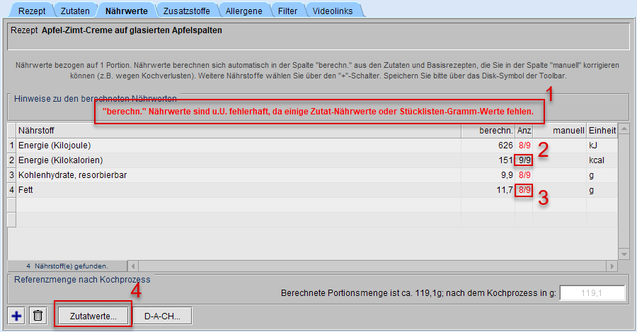 Informationen über die Einzelnährwerte pro Zutat bekommen Sie mit Klick auf die Schaltfläche [Zutatwerte...] (s. Markierung 4).