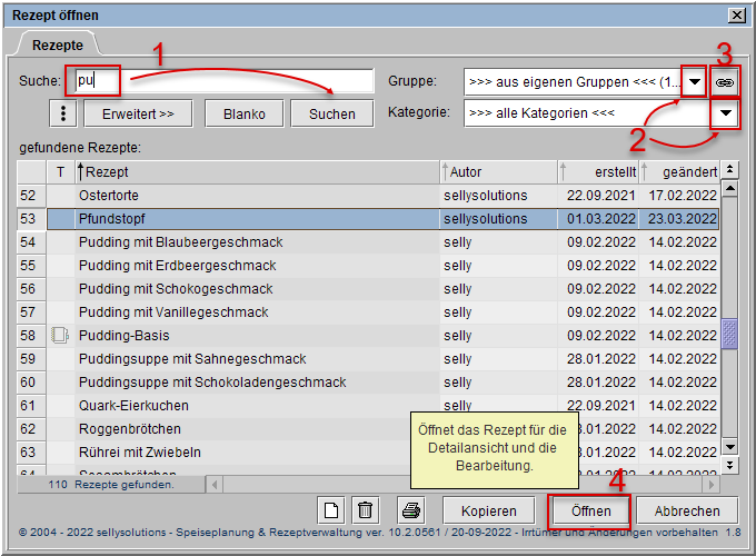 Sie markieren das Rezept in der Liste und klicken auf Öffnen (s. Markierung 4).