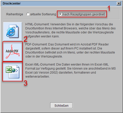 Wählen Sie zuerst die Option nach Rezeptgruppen geordnet (s. Markierung 1) und nachfolgend die Ausgabeform (s. Markierung 2+3).