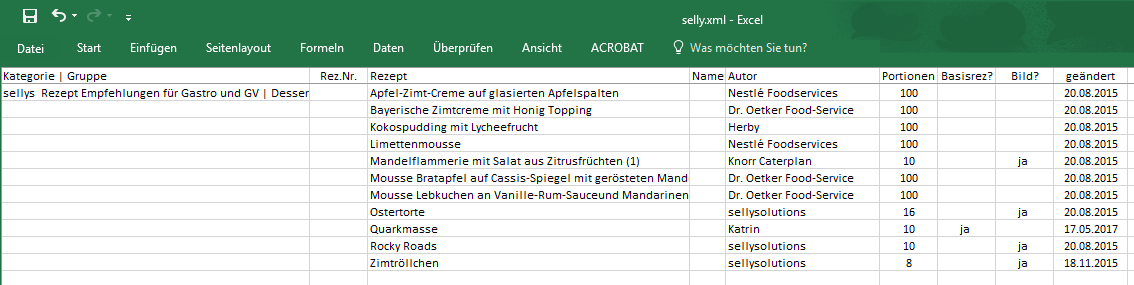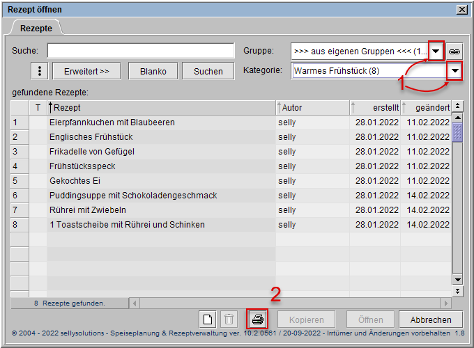 angezeigt werden, d. h. Sie wählen zuvor eine Rezeptgruppe oder nutzen einen entsprechenden Suchbegriff, um die Rezeptliste einzuschränken (s. Markierungen 1).